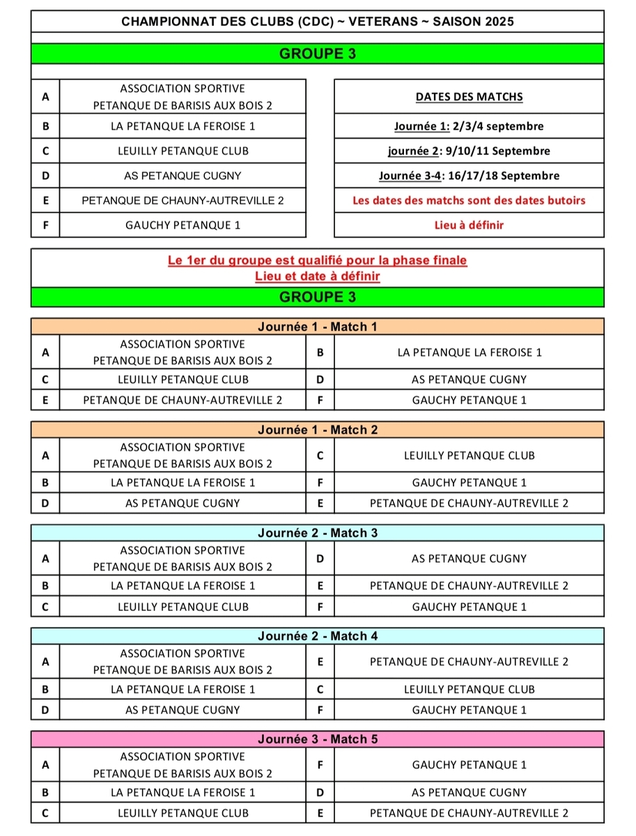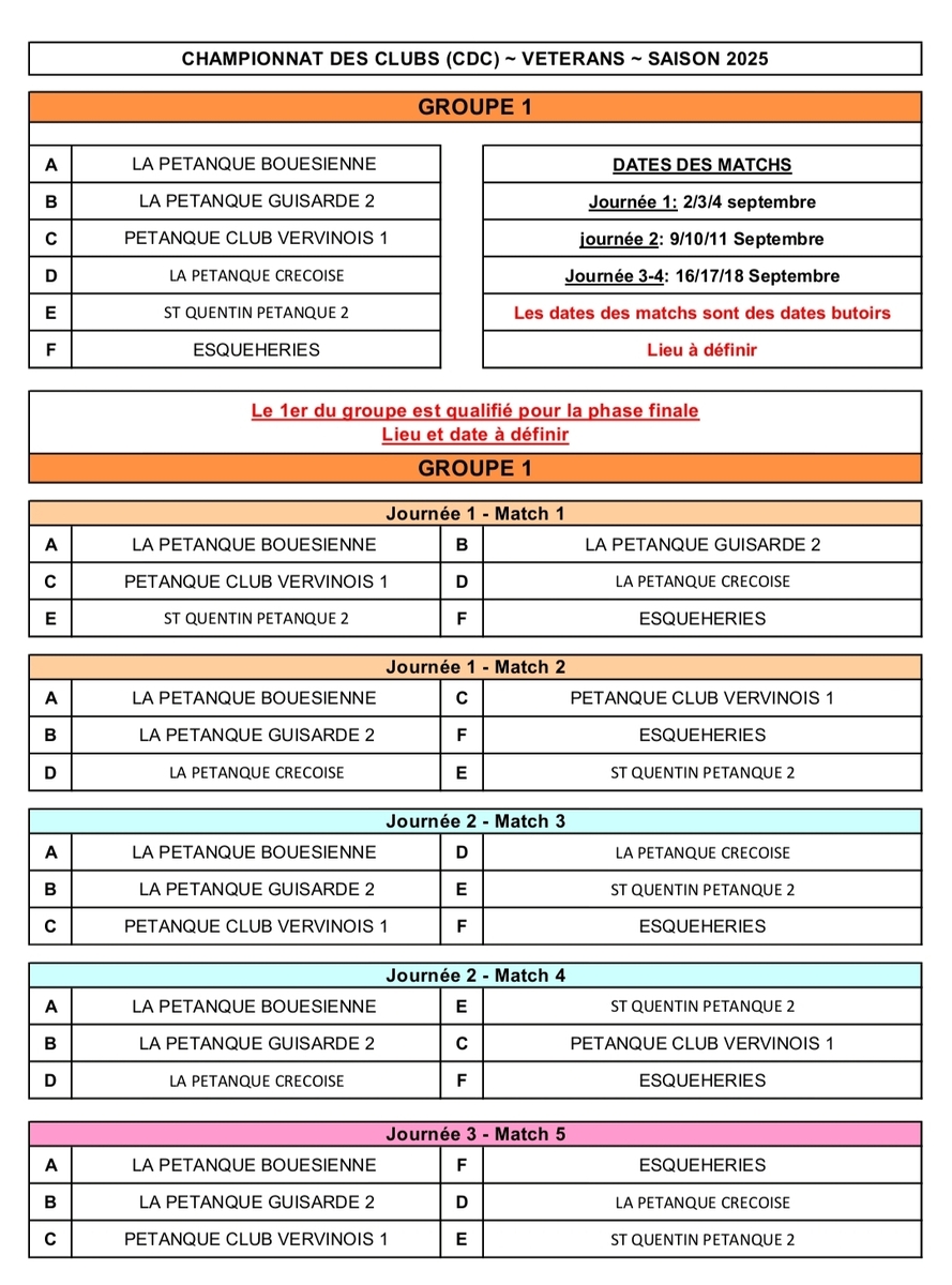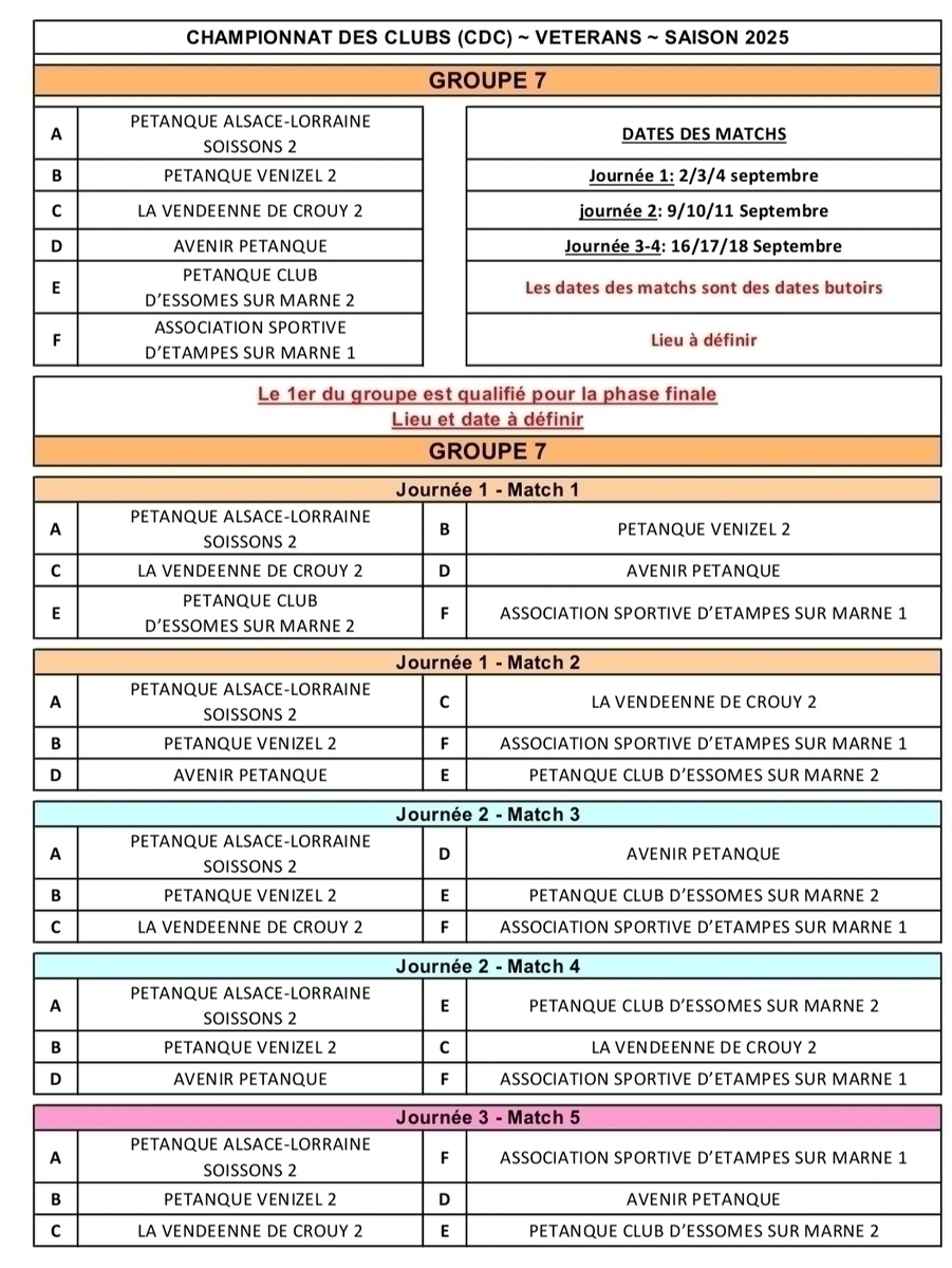 suite à notre réunion de bureau du 01/08 en prévision du CRC vétéran et du CDC vétéran qui vont se jouer en septembre, la composition des 3 équipes a été entériné. En pièce jointe vous pourrez trouver les tirages (groupe 7 et 8 pour nos 2 équipes engagées en départemental).En cas de non participation ou d impossibilité pour vous d etre dispo à une des dates MERCI d'en informer les capitaines d'équipe.