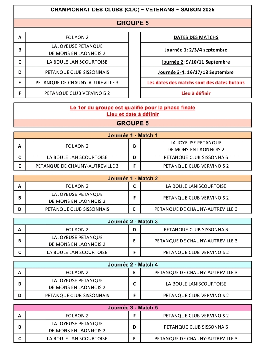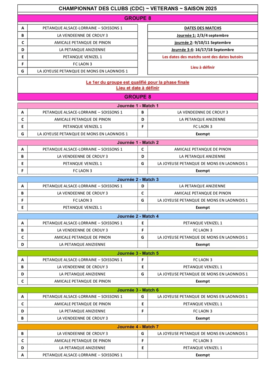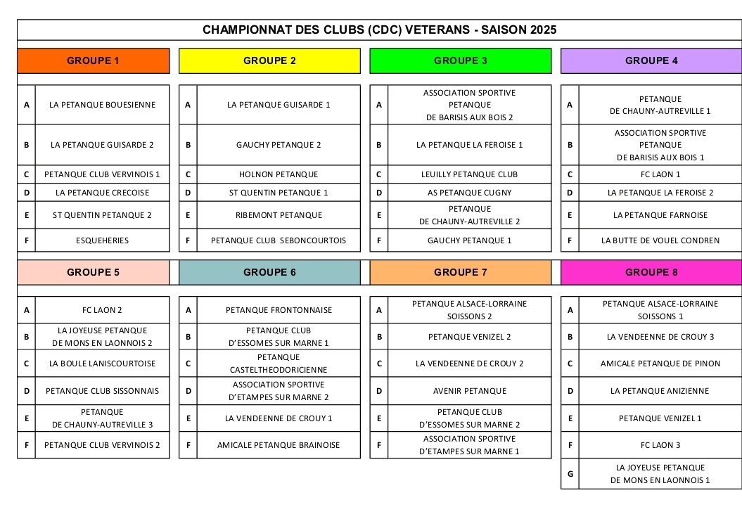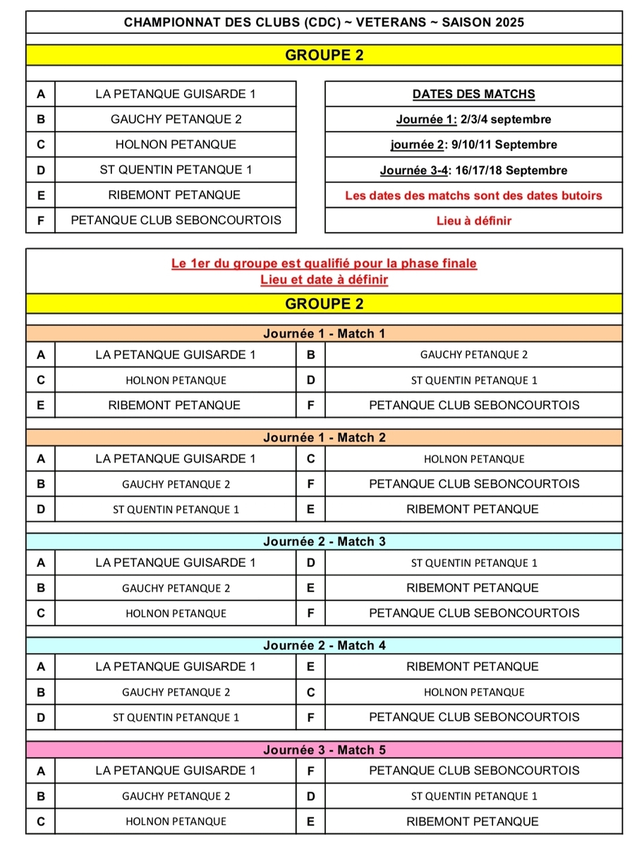 suite à notre réunion de bureau du 01/08 en prévision du CRC vétéran et du CDC vétéran qui vont se jouer en septembre, la composition des 3 équipes a été entériné. En pièce jointe vous pourrez trouver les tirages (groupe 7 et 8 pour nos 2 équipes engagées en départemental).En cas de non participation ou d impossibilité pour vous d etre dispo à une des dates MERCI d'en informer les capitaines d'équipe.