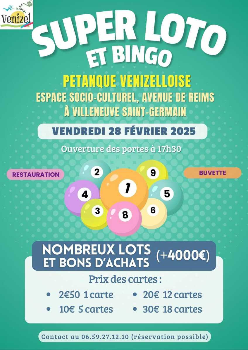 SUPER LOTO organisé par la pétanque de Venizel le vendredi 28 fevrier 2025 à l'espace socio-culturel de Villeneuve Saint Germain ( ouverture des portes dès 17H30 ) .